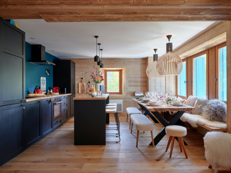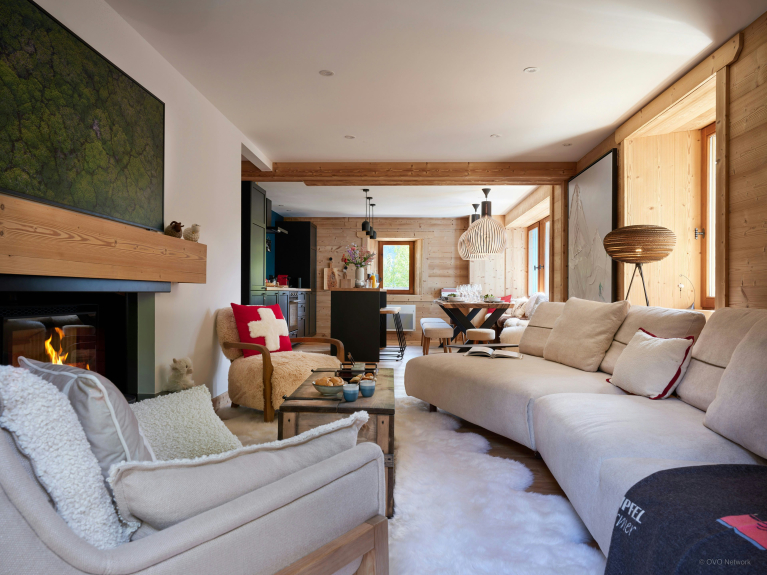 Het grote terras belichaamt de kunst van het leven op grote hoogte, met een bank, ligstoelen en een eettafel, en een prachtig uitzicht op de bergen van Val d'Arly. Een discreet Scandinavisch bad biedt een echte bubbel van welzijn, en een kleine glooiende tuin maakt de buitenruimte compleet.