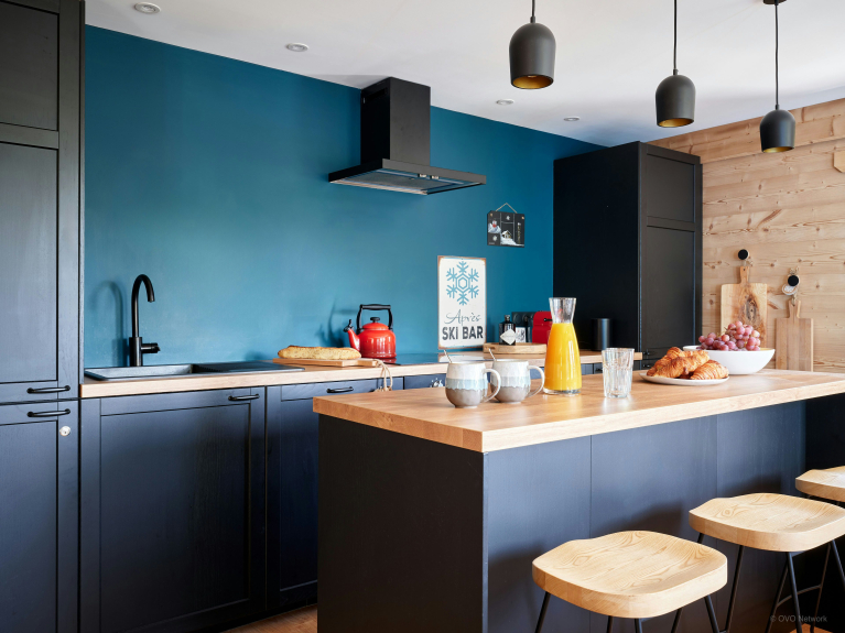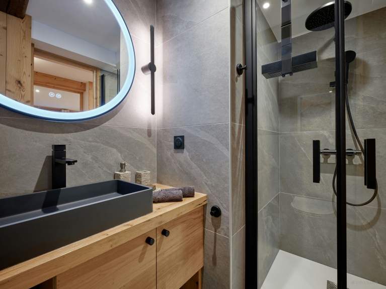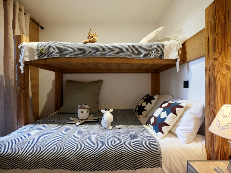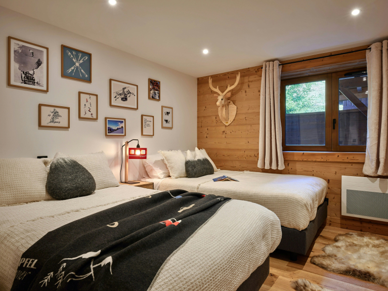 Drie slaapkamers en twee badkamers vormen samen Chalet Belle Source A, een elegant gelijkvloers appartement voor acht vakantiegangers, waar elk detail is ontworpen om comfort te combineren met alpine authenticiteit.