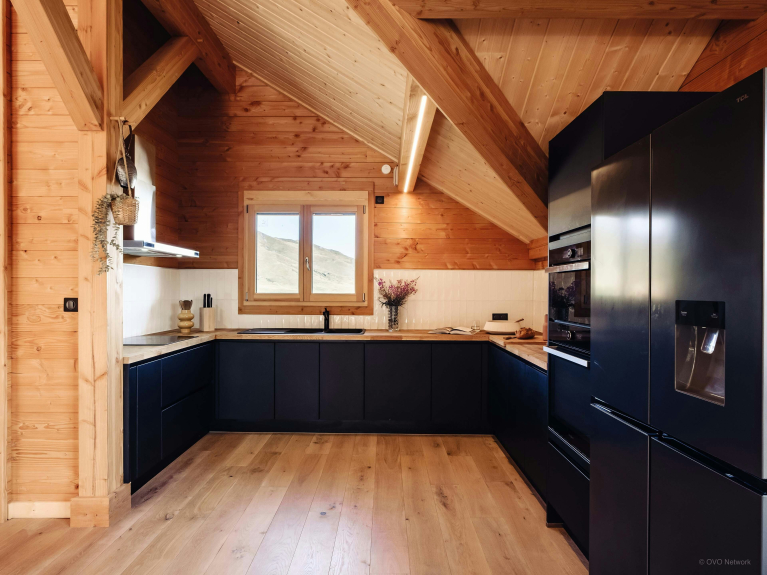 Helemaal bovenaan opent de woonkamer zich als een balkon naar de Alpen. De erkers overspoelen de ruimte met licht en bieden toegang tot twee balkons. Een centrale open haard, omringd door een gezellige zithoek, scheidt de comfortabele woonkamer van het eetgedeelte. In de keuken moedigt de moderne apparatuur van topklasse je aan om heerlijke maaltijden te bereiden.
