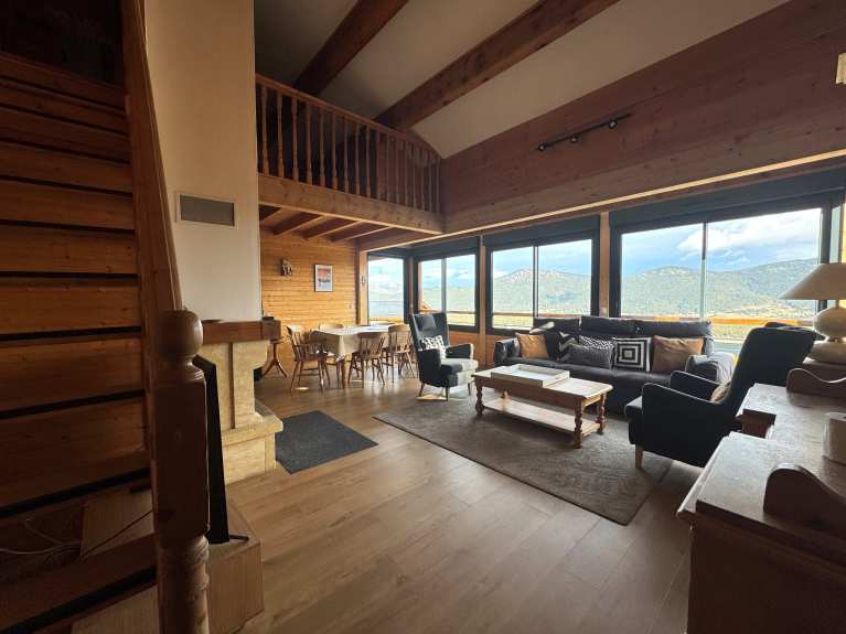 Het chalet van 90 m² is gelegen in een rustige omgeving met een ongerept uitzicht op het meer van Matemale en de keten van bergen, op het zuidoosten. Het biedt een licht en comfortabel verblijf met een bank, fauteuils, televisie en insert schoorsteen, een volledig uitgeruste keuken met inductieplaat vier branden, koelkast met vriesvak, vaatwasser, afzuigkap, oven, magnetrons en wasmachine.