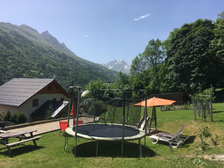 Aan de achterkant van het chalet, een uitgestrekte weide met buitenspelen (trampoline, petanqueterrein, schommel)