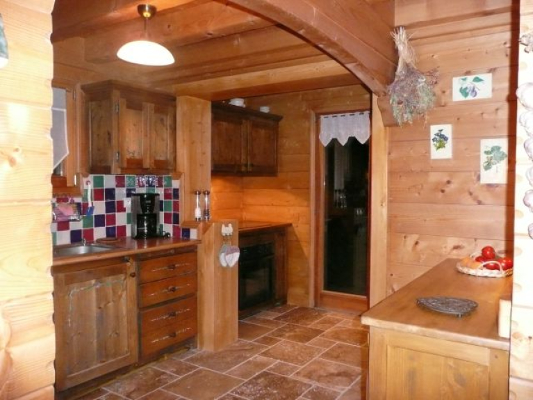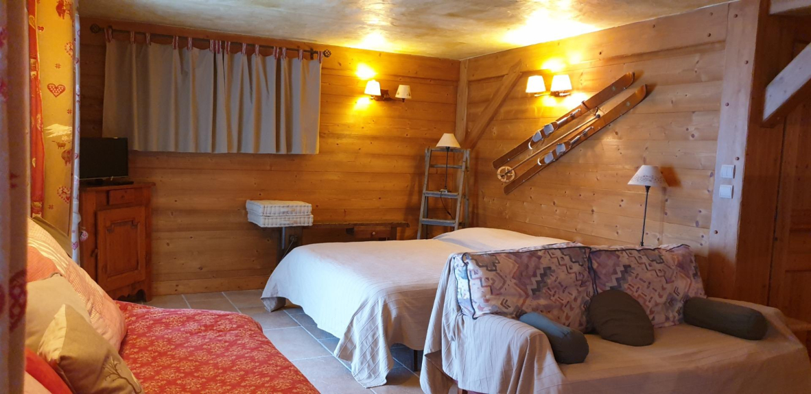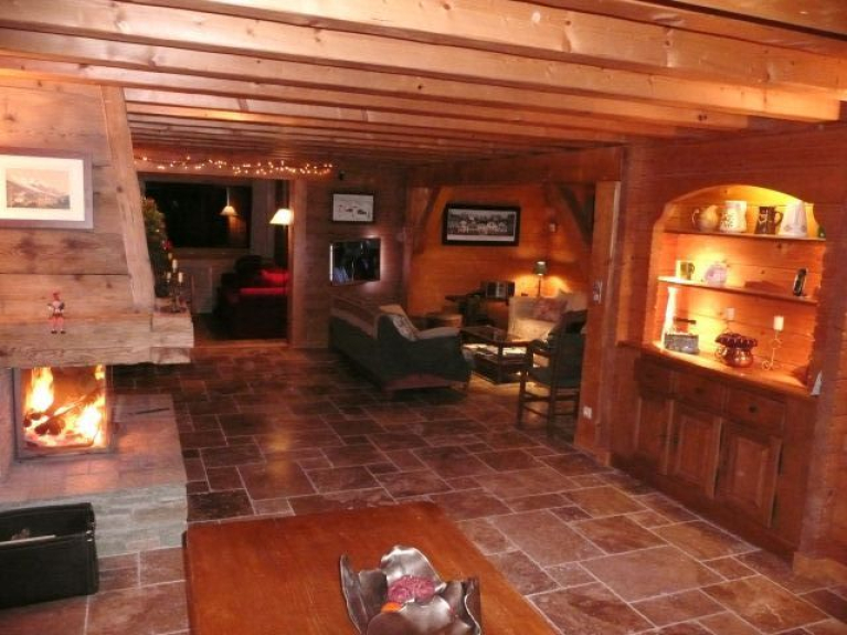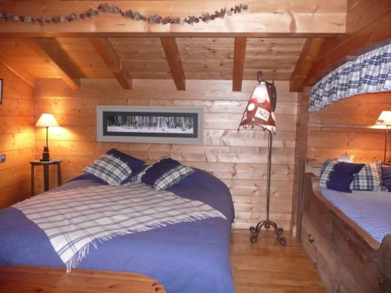 Dit chalet bestaat uit drie niveaus. Op de begane grond: entree, grote woonkamer met open haard, eethoek, salon, mini-lounge veranda, keuken, badkamer met bad, douche en WC, aparte WC. Op de eerste verdieping: twee grote slaapkamers met twee bedden van 1,60 m en een bed van 0,90 m voor een van hen, een kleine slaapkamer met een bed van 1,40 m, een badkamer met een ligbad en twee wastafels, een onafhankelijke WC. In het souterrain/tuinniveau: een grote ontspanningsruimte met een bedgedeelte (twee bedden van 0,80x2 meter die kunnen worden samengevoegd tot een groot bed van 1,60 mx2 meter), een uitschuifbare slaapbank (2 bedden van 0,80x1,90), een bar in oud hout (bestaande uit een gootsteen, twee kookplaten, een mini-koelkast, een elektrisch koffiezetapparaat), een doucheruimte met douche, WC en sauna.