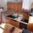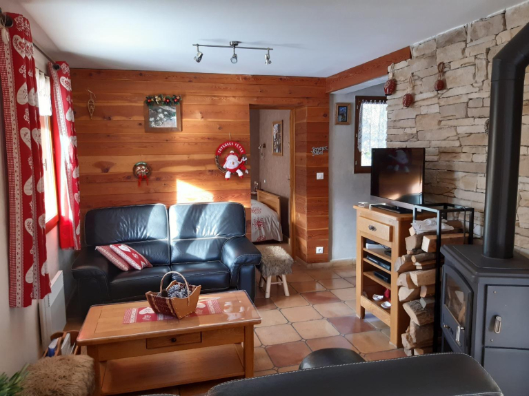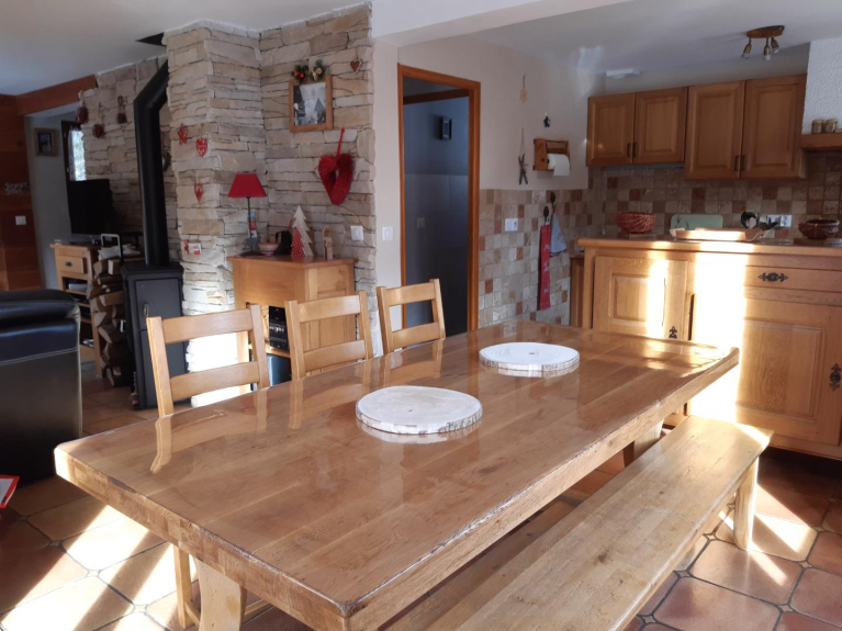 # 1 woonkamer: salon (massief eiken meubelen en lederen zetels) met houtkachel (hout voorzien), eetkamer en open keuken (traditionele oven, microgolfoven, vaatwasmachine, fondue, raclette, pierrade en crêpe party sets, espressomachine, enz.)