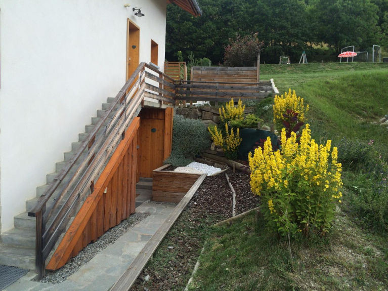 Aan de achterkant van het chalet, een grote weide met buitenspelen (trampoline, petanque veld, schommel).