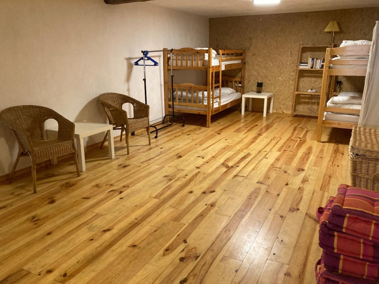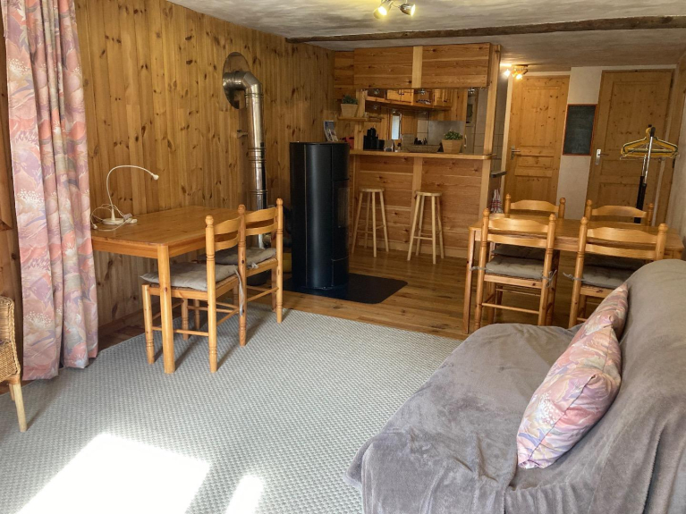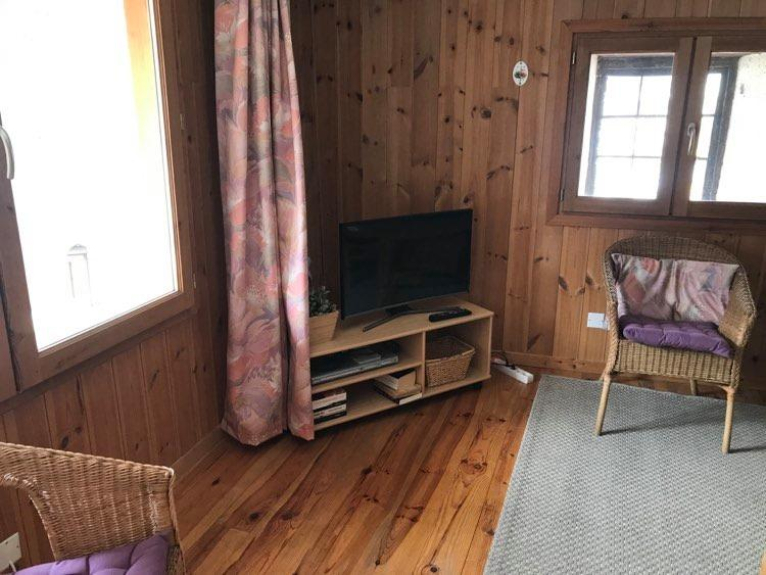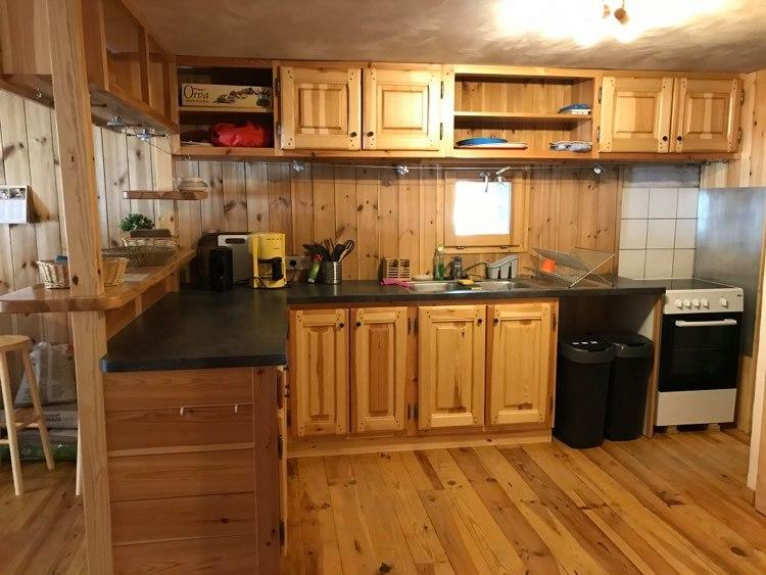 Volledig gerenoveerd, volledig van hout, met pelletkachel, grote woon-/eetkamer en volledig ingerichte keuken, een slaapkamer met tweepersoonsbed, douche, WC. Daarnaast een grote slaapkamer (niet meegerekend in de 50m2) met 4 stapelbedden.