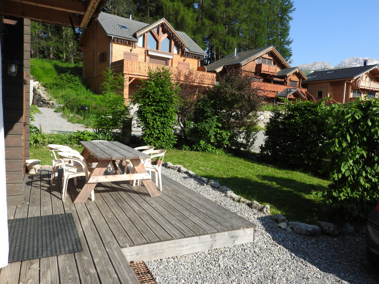 * Het terras is beschut tegen de wind en ligt op het zuiden, en is zonnig tot zonsondergang. Het is zeer aangenaam in de winter en in de zomer wat een geluk om het aperitief te nemen of buiten te eten terwijl de kinderen in alle veiligheid op het terrein rond de chalet spelen.