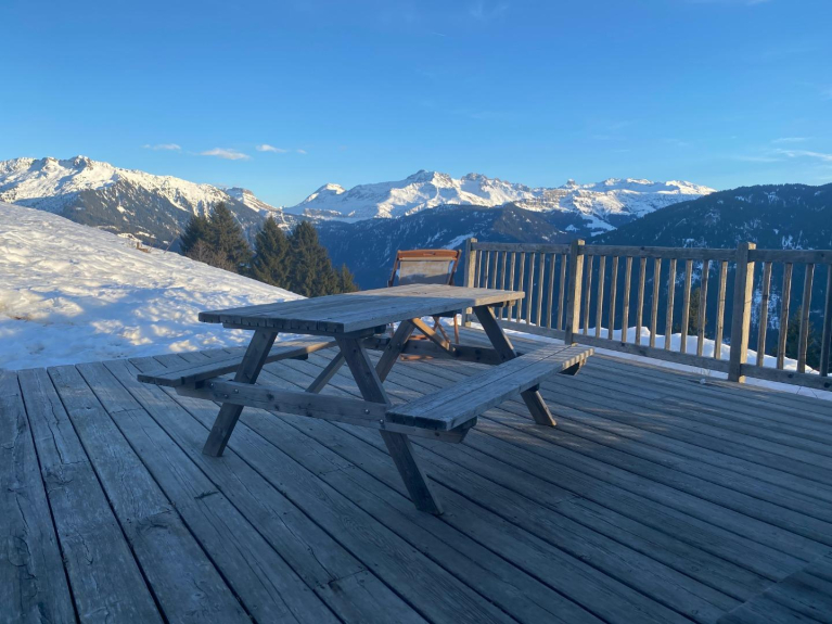 Authentiek alpine chalet op het zuiden (zonzijde) gelegen op 1460m. Volledig gerenoveerd, biedt het alle moderne comfort en een prachtig panoramisch uitzicht. Slechts 500m van de pistes over de weg en van de plaatselijke winkels (kruidenier, skiverhuur, restaurant).